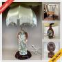 WHAT IS IN THIS AUCTION?   This online auction features vintage oil lamps, Satsuma vase, MCM candle holders, wood carvings, teacup/saucer sets, angel statue lamp, vintage candelabra, Rapael Perez pottery,  Navajo sand painting, steamer tr