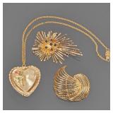 DIAMOND, SAPPHIRE, RUBY & 14K GOLD PIN | Designed as a brushed yellow gold heart set with round rubi