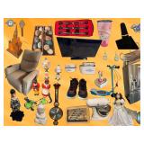 Contents of clock shelves includes Avon egg shaped pink music box, shoes, doll, etc