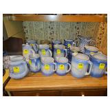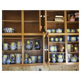 Very large beautiful vintage Blue and White Spongeware Stoneware Pitcher 8" round x 10" tip of spout to back of handle x 11.5" h in excellent vintage condition...