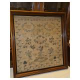 Vintage framed 18.5×21.5" sampler (the thread was the same color as the background, so it made it hard to make out what the information was) SEE PICS FOR MORE DETAILS...