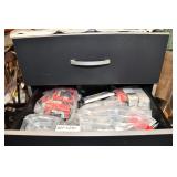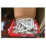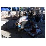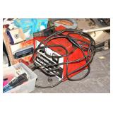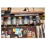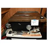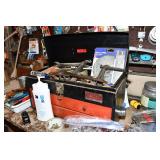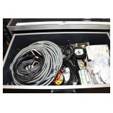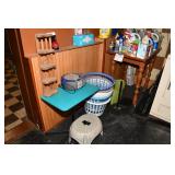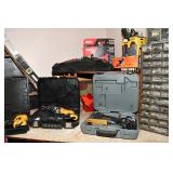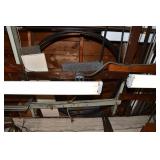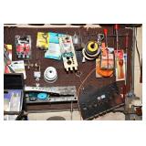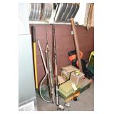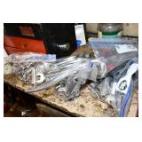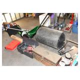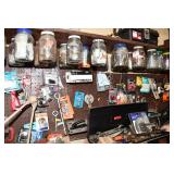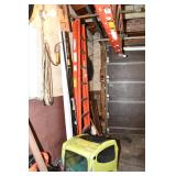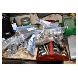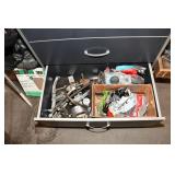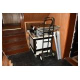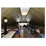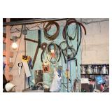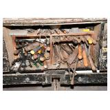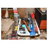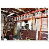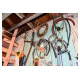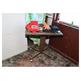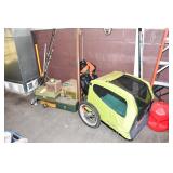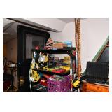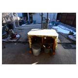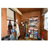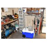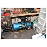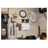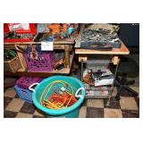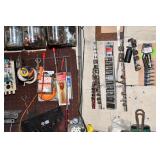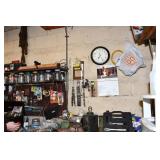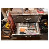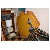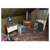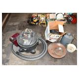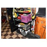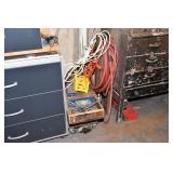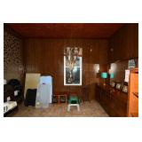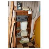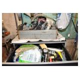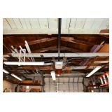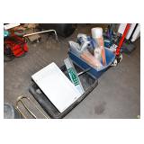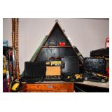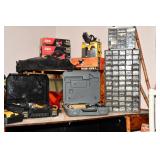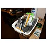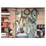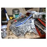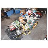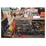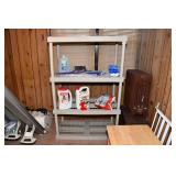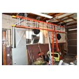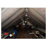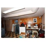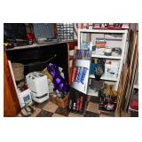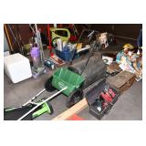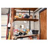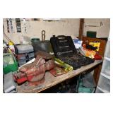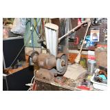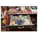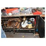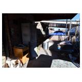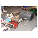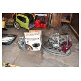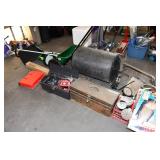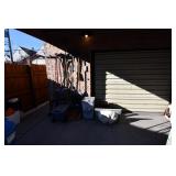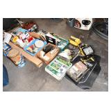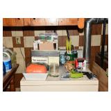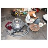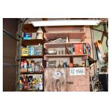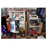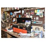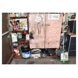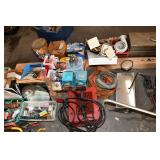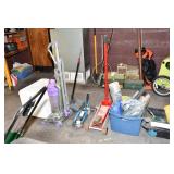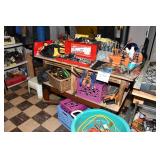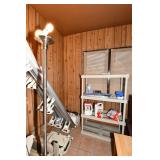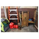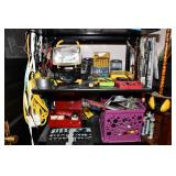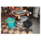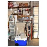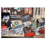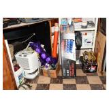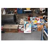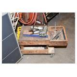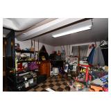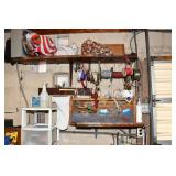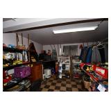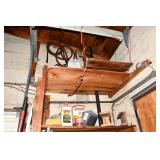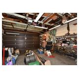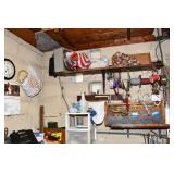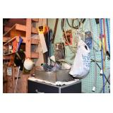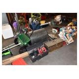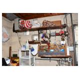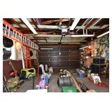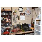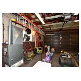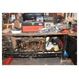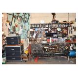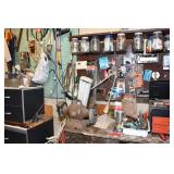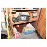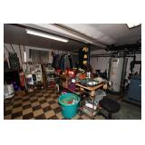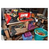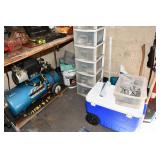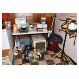 Work bench Table saw Tile cutters Grinder Air compressor Power drills Heaters Ac units Folding table Dog crate Shop vacs Work lights Drill bits Hand tools Push lawn mower Painting supplies Storage rack Table saw Honda 5.0 motor Boards and wood