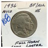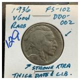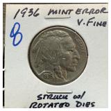1936 BUFFALO NICKEL STRUCK W ROTATED DIES |