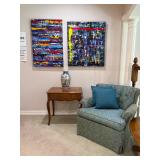 An assortment of Original Mid Century Paintings- Artist such as Victor Candell, Alfred Birdsey and others.. Contemporary works by Chis Falokos, B. Shaw (‘Redeye from Vegas’ and ‘Key West Horizon’) and more..