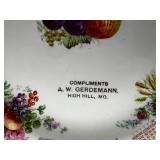 Glass, Crystal, Pottery & Ceramics · Royal Bayreuth Bavaria porcelain Jack & the Beanstalk cup & saucer · Pair of German boy & girl figures · Burleigh Ware England white & colorful glazed open top pitcher Burgess & Leigh · The Trenle China Co E. Liverpool Porcelain cat tea up and saucer · Carnation McNicol porcelain painted plate · Imperial China Mrs. Roosevelt and Mrs. McKinley ceramic plates First Ladies · Florence Cook Pottery Co Little Girl glazed ceramic plate · Floral decorated ceramic plate with handles · Made in Austrai HAAG ceramic plate & cup · Oepose Limoges France T & V Floral covered dish and plate · Carved bear figure · 1912 Calendar plate LW Haupt Matson, Missouri · 1920 calendar ceramic plate, World War I commemorative plate · 1913 calendar ceramic plate, Wright Brothers, Long & Sons Bollivar Illinois · 1910 calendar ceramic plate, Aug. Kalbitz Jeweler & Optician, Red Bud, Illinois · 1915 calendar ceramic plate, Bruning, Mische & Bruning Wright City, Missouri · 1918 calendar ceramic plate, J Nieder Krakow, Missouri · 1909 calendar ceramic plate, floral · 1909 calendar ceramic plate, C. B. Treat & Co., Buchanan, Michigan · 1910 calendar ceramic plate · 1905 calendar ceramic plate, Merry Christmas Gerhart & Mayer Robesonia, PA · Round Oak Stoves ceramic advertising plate, “Doe-Wah-Jack” · Ceramic fruit still life plate, Complements of Aug. Kissner 6551 Easton Ave · Ceramic souvenir plate in commemoration for the opening of the new store The Stock-Peterman House Furnishing Co St. Louis, MO · Ceramic 1910 calendar plate, J. H. Moehlenkamp, Harvester, Missouri · Ceramic 1913 calendar plate, J. H. Moehlenkamp, Harvester, Missouri · Ceramic 1911 calendar plate, A.R. Huning Dry Goods, St. Charles, MO · Ceramic 1910 calendar plate, Gentemann Mercantile O’Fallon, MO · Ceramic 1911 calendar plate, Auld Lang Sine · Ceramic 1924 calendar plate, Chas F Bunding & Son Weldon Spring, MO · Ceramic 1912 calendar plate, Oberle Brothers, Weldon Spring, MO · Ceramic 1911 calendar plate, E.O. Gerdemann Pendleton, MO · Muschany Brothers Howell, MO ceramic plate · The Rowland & Marsallus souvenir St. Louis ceramic plate · Blue & white ceramic platter · Milk glass Easter plates · Semi-Vitreous Buffalo Pottery “The Gunner” 1901 No 1317 ceramic plate · Ceramic cow creamer · Ceramic moose creamer, Austria · Pressed glass footed bowl · Lemp Brewery ceramic stein mug, St. Louis, Missouri · Ceramic blue & white stein with metal flip top · St Louis stoneware stein · Stoneware stein with metal flip top lid · German open top stein · Blue & white ceramic open top stein · Amber glass vase with clear handles · Cut glass knife rest · Clear pressed glass cruet · Clear glass syrup pitcher · Ceramic footed bowl · Ceramic shaker with silver top · German monkey face two piece reamer childs set · Ceramic floral pitcher · Ceramic standing cow creamer · Ceramic Leuchtenburg Germany pitcher · Ceramic character mug · 1904 World’s Fair glass plate · Floral ceramic floral footed bowl · Ceramic painted egg · 1936 Royal Daulton “Bunnykins” ceramic pieces · Clear pressed glass footed bowl · Ceramic “Forget Me Not” Made in Germany cup · Ceramic child mug · Ceramic cruet set · Fenton milk glass vase · Blue owl pitcher · Milk glass covered sugar bowl · Carved soapstone · Carved candle holders · Ceramic white platter · Royal Ironstone white ceramic platter · Frosted glass Westward Ho covered dish · Royal Ironstone covered dish · Ceramic floral platter · Ceramic floral plates set of 4 · Carved soapstone · 1915 ceramic calendar plate, J H Moehlenkamp Harvester, MO · 1910 ceramic calendar plate, A. W. Gerdemann High Hill, MO · 1914 ceramic calendar plate, J H Moehlenkamp, Harvester, MO · Clear press glassed footed bowl · Ceramic oval platter made in Germany · “Blossom Time” Royal Albert Crown China floral sugar and creamer · Red & clear glass vessel with metal handle · Clear pressed glass pitcher · Clear & purple glass dish · Blue & white ceramic cups · Johnson Brothers Semi-Porcelain blue & white covered casserole · Bavarian oval ceramic platter · Capodimonte ceramic floral candle holders made in Italy · Milk glass soap dish · Milk glass rectangle vessel · Clear pressed glass pieces · Round silver plate · Ceramic girl figure · Milk glass hands dish · Glass lantern saltshaker · LE Smith art glass orange slag glass covered urn · Clarke’s Pure Rye ceramic plate · Wood case with gears and crank handle · Cobalt blue glass vase with white & gold accents · Ceramic clock with green man image · Silver plate hand mirror · Green glass violin bottles · Blue glass violin bottles · Colorful ceramic owl pocket · Salt crock with original lid, blue & white · Anchor Hocking milk glass salt and pepper set · Milk glass compote · Various glass & ceramic small vessels · Trio of owls ceramic planter · Diamond Pottery Co made in USA blue & white piece