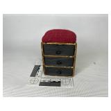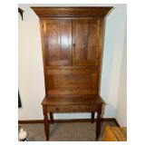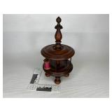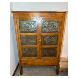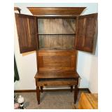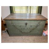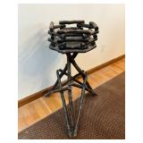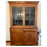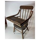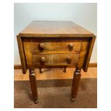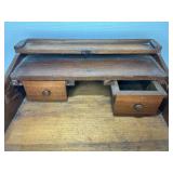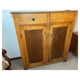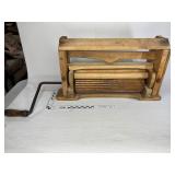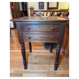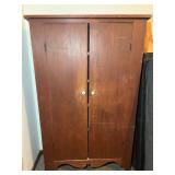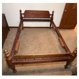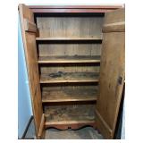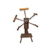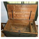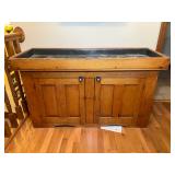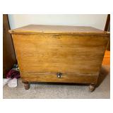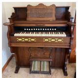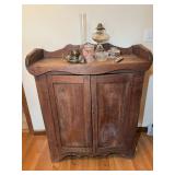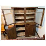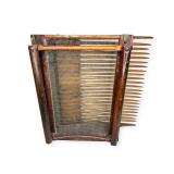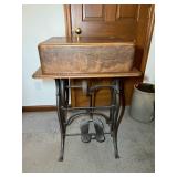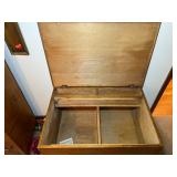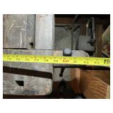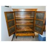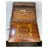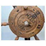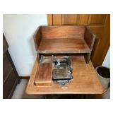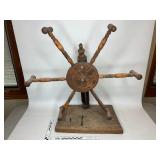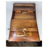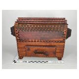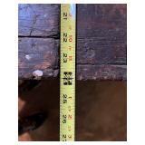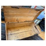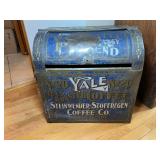 Furniture · Large floor sitting primitive basket with lid · Large breakdown armoire · Yarn winder · Primitive wooden cradle · Spinning Wheel · Wooden green painted potty child’s potty chair · Cabinet covered in wooden spools · General store Yale Coffee Tin Dispenser Steinwender- Stoffregen Coffee Co. · Primitive linen cabinet with a red tint · Wall mounted wooden cabinet with hinged door · Wooden blanket chest/trunk · Wood washstand · Wood table with single drawer · 2 Drawer wood drop leaf table · Large solid wood trunk with 2 locks · Wood/sticks plant stand · Wooden ladder-back chairs with woven cane seats · Wooden washstand · Wooden sugar chest · 2 Drawer & 2 door wooden cabinet · Dark wood upholstered rocking chair · Wall mounted wooden cabinet with small mirror, hinged door and small shelf · Wooden 2 drawer side table · Plantation desk · Wooden and iron schoolhouse desk · Primitive wooden cabinet with screen inserts · Early 4 drawer dresser with replacement handles, this dresser is from the Howard family and was at the house that Jesse James took refuge, with documentation and Howard family bonnets and apron · Antique sewing machine · 1837 Green & floral pained flat top trunk with hinged lid · Sno Shoe chair-foldable made in Norway Maine · Mid Century Modern accordion folding sewing box on legs · Primitive 2 door cabinet with scalloped top · Large dry sink · Wall mount wooden pegged rack · Rope bed-modified to fit a mattress · Pie safe · Early farm table/worktable with 2 drawers 96” long, 41” wide, 29” tall · Large china cabinet · High back wooden swivel organ stool · Wooden pump organ, holds air and plays beautifully · Carpenter’s workbench with 2 clamps 82.5” long, 24” wide, 33” tall