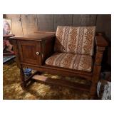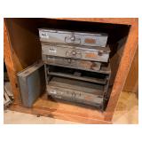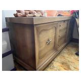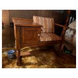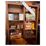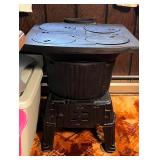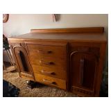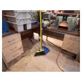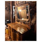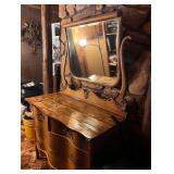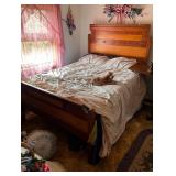 Household & Misc. 2 overstuffed upholstered recliners, antique ornate bow front mirrored dresser, gossip bench, Antique full size maple bed, Round dining room table w/6 chairs, mid-century modern sideboard, Blonde cedar chest, misc. occ tables, computer desk, Lg wall shelving unit, 2 - cast iron parlor stoves,