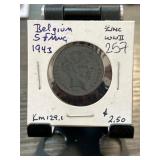 1943 Belgium 5 Franc Zinc Coin from World War II |