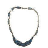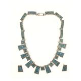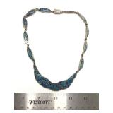 Sterling silver necklace featuring crushed turquoise inlay. 70.14 grams of total weight. 18 inches in length. Made in Taxco, Mexico. Hallmarked TA-91
