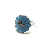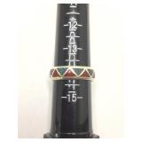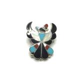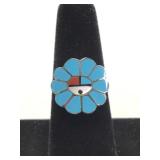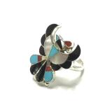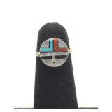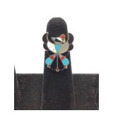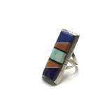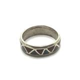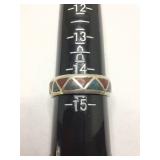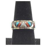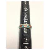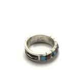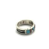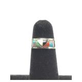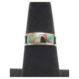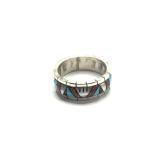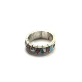 Sterling silver ring featuring multiple stone inlay. 10.85 grams of total weight. Size 6 1/2. Made by Frank Yazzie.