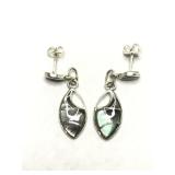 Sterling silver earrings with mother of pearl inlay. 3.42 grams total weight. Made by Faye Leekya.