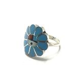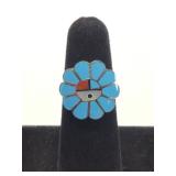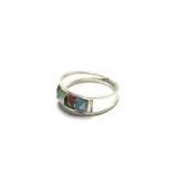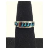 Sterling silver ring with crushed turquoise and red coral inlay. 6.64 grams total weight. Size 14.
