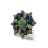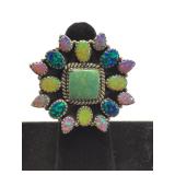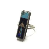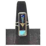 Sterling silver ring with multiple stone inlay. 6.57 grams total weight. Size 11 1/2. Made by Phyllis Lucio.