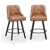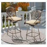 Zimtown 2Pcs Outdoor Swivel Bar Stools feature corrosion-resistant cast aluminum frames with triple-layer coating, ideal for coastal/rainy environments. The(high-resiliency foam + breathable olefin fabric) ensure cool comfort in extreme heat. Ergonomically curved armrests, and self-leveling silicone feet stabilize on uneven surfaces. Industrial ball-bearing swivel supports 380 lbs and silent 360° rotation. Matte bronze scrollwork bases suit both outdoor lounges and indoor kitchens. Tool-free assembly in 18 minutes; compact fits standard counters. Includes under-seat hooks for accessories.