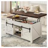 Lift Top Coffee Table for Living Room with 4 Sliding Barn Doors, 4 in 1 Farmhouse Coffee Table with Adjustable Shelves and Hidden Storage Compartment, Converts to Dining Table (Brown White)