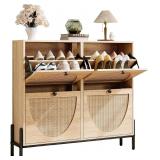 IRONCK Rattan Shoe Cabinet Storage with 4 Flip Drawers, Freestanding Shoe Storage Organizer Cabinet for Entryway, Narrow Shoe Rack Cabinet, Oak