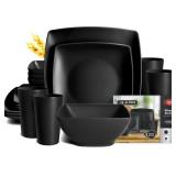 16-piece Plastic Wheat Straw Square Dinnerware Set for 4, Unbreakable Dinner Plates, Salad Plates, Snack Bowls, Tumblers 13.5 oz, Dishwasher Safe, Black Matte