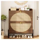 IRONCK Shoe Cabinet Storage with 2 Flip Drawers, Free Standing Wooden Shoe Storage Organizer Cabinet with Rattan Doors for Entryway, Narrow Shoe Rack Cabinet, Walnut