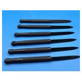 These knives are from a local estate and were obtained in the 70's and 80's by the owner. They have been in storage for many years. Most of these high-quality knives were made in Japan and appear to have never been sharpened. The knives are very sharp, like surgical steel, and require extreme care when handling them. Be sure your state allows you to own them before you bid. Shipping is available to the winning bidder at their expense. |