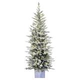 (147). Puleo International Pre-Lit Potted Flocked Arctic Fir Pencil Artifical Artificial Christmas Tree, Green, 301-PTO9760-60LW120