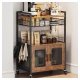 (114). Coffee Bar Cabinet, 3 Tier Coffee Station Table on Wheels, 35.9" H Bar Cart with Wire Basket Drawer & 5 Hooks for Home Kitchen, Liquor Buffet Sideboard Cabinet (Rustic Brown)