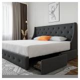 King Size Platform Bed Frame with 4 Storage Drawers and Wingback Headboard, Diamond Stitched Button Tufted Design, No Box Spring Needed, Dark Grey