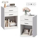 Night Stand Set of 2 with Charging Station, Nightstands with Wood Drawers and Open Shelf, Bed Side Tables Living Room, Bedroom, Modern End Table Set 2, White