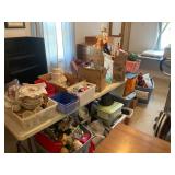 Snow blower, Master Michanic tool box with tools,coolers,dishes,small kitchen appliances, holiday decorations, sheperd's hook, shelving, electric heaters, master craft (brand new), fuel cans, hand tools, elec. cords, small gas 3500 w generator, other miscellaneous items. Dining room table - 6 chairs, buffet, china cabinet, blue sofa, toy chest, tv stand, love seat, end table, corner glass door cabinet, element flat screen tv, emmerson dvd-cd player, bear collection. wooden rocker, recliner, electric F.P., glass table, drop leaf desk, shelf unit, sewing basket, small rocker, rocking horse, book shelf, sewing machine, computer desk, day bed, pedestal mirror, 5 drawer chest, cedar chest, wicker rocker, mirrord dresser and bed. |