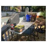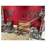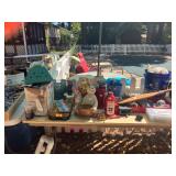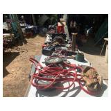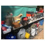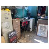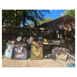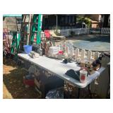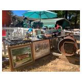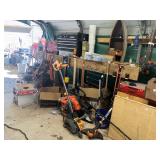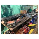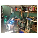 Large selection of power tools and hand tools, ladders, fishing rods, bottles, outdoor chairs, garden tools. Antique pie safe, side board, record player, iron sewing machine base, cash register, coocoo clock and much much more |