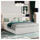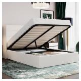 Full Size Lift Up Storage Bed/Velvet Upholstered/Modern Wingback Headboard/Upholstered Platform Bed Frame/Hydraulic Storage/No Box Spring Needed/White