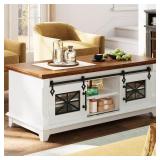 IRONCK 48'' Coffee Table with Sliding Barn Doors, Rustic Center Table with 6 Large Storage Space, Glass Doors and Adjustable Middle Shelf, Farmhouse Coffee Tables for Living Room, Whit