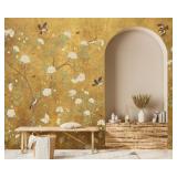 Plum Blossom Mural Wallpaper, Golden Background Floral Wall Mural, Chinoiserie Bird Flower Mural, Vintage Branches Wallpaper for Living Room, Bedroom, Dinning Room 161"x108"(Not Peel and Stick)