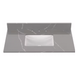 - A handsome Almond Latte lacquered finish complements its luxurious straight edged slab of white engineered marble top, with an undermount rectangular sink and matching 3-inch high backsplash.