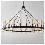 (39) 60 Inch Black Wagon Wheel Chandelier, 24 Lights, with Brown Glass Shade, Large Hanging High Ceilings Chandeliers for Dining Room Kitchen Foyer Entryway Living Room