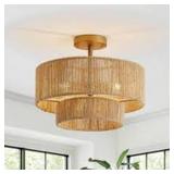 Flint Garden 15.4 in. 3-Light Bohemian Antique Gold Two-Tier Drum Semi- Flush Mount with Natural Jute Rope Shade