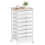 Storage Cart with 8 Drawers, Utility Cart with White Drawers and Wooden Tabletop, Craft Cart, Teacher Organization for Classroom