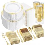 YOUBET 700PCS Gold Plastic Dinnerware Set - White and Gold Disposable Plates for 100 Guest - 200 Disposable Plates, 300 Heavy Duty Plastic Silverware, 100...