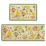 Green Floral Kitchen Rug Set of 2 (47x17 +17x30) Non-Slip Backing Kitchen Mat 2 Piece Water Resistant Kitchen Flowers Rug