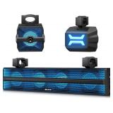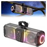 - [Dynamic RGB Lighting]The subwoofer has additional RGB LED lights on the center and sides, creating a cool and stunning effect as the lights reflect onto the vibrating utv speakers. The two full-range speakers come with blue LED lights that change in brightness with the volume, adding a dynamic and stylish visual element. Light and music merge for a thrilling rock audiovisual experience on your journey