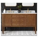 (126). Home Decorators Collection Collette 60 in. Double Sink Cinnamon Oak Bath Vanity with White Carrara Marble Top (Assembled)