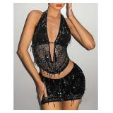 SOLY HUX Women's 2 Piece Party Club Outfit Sequin Tie Backless Sheer Halter Crop Top and Mini Skirt Set (S)