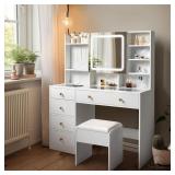Vanity Desk with 3 Color Lighted Mirror, 6 Drawers Makeup Vanity, Dressing Table Makeup Desk with Stool, White