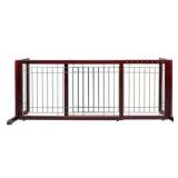 This freestanding pet gate provides versatile protection without installation, featuring an adjustable width from 36.6" to 67.5" and a convenient 21" step-over height. Crafted from solid wood and metal with scratch-resistant rubber pads, it combines elegant cherry finish with sturdy construction that resists tipping. Perfect for doorways, stairs, and wide openings, the gate sets up instantly and folds flat for storage—ideal for small dogs under 17.5 lbs.