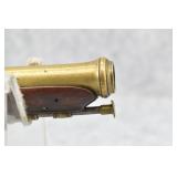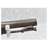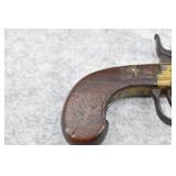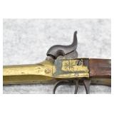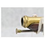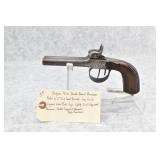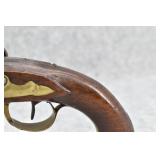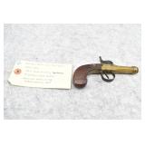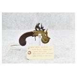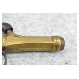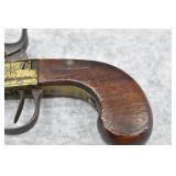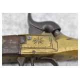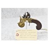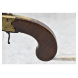 63. English Percussion Muff Pistol – 38 Cal. Black Powder, Top Hammer Pistol – w/2” Brass Cannon Style Barrel – w/Engraved Brass Frame w/Proof Mark on Left Side – Circa 1850