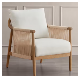 - This armchair, inspired by timeless bamboo design patterns, brings a light, natural ambiance to your living room or bedroom. It features angled armrests braided with textured paper cord, adding a touch of organic charm. Crafted from solid and engineered wood, this chair rests on slim, tapered legs for a mid-century silhouette.