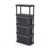 This Black Plastic Hyper Tough 5-Shelf Shelving Unit is perfect for your storage needs. Made of a durable polypropylene material, this storage unit is perfect in the garage. Store up to 350 pounds of material. Also do not worry about tools, as this is easily assembled with no tools required.