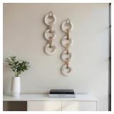 Elevate your walls with this set of 2 linked wall sculptures, designed to bring sculptural texture and vertical movement to your interior. Crafted with an elegant chain-link silhouette and finished in a versatile white and gold palette, these decorative objects add interest and balance to modern farmhouse decor or transitional spaces. Whether hung as indoor statues above a console or leaned against a wall on open shelving, they complement figurines and sculptures with ease. Their lightweight design makes them ideal for layering into gallery walls or using as table sculptures displayed vertically. Use in living rooms, entryways, or workspaces to add an artful presence. Each piece varies in size, measuring 26" and 35", giving your arrangement natural height and rhythm. A perfect pair to complete a curated, dimensional look.