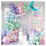 - [Package Includes]: This mermaid balloon arch kit includes a total of 145 balloons in different sizes: 18”, 10”, and 5”. The kit features 7 beautiful colors—purple, lavender, pastel pink, light blue, teal green, pearl white, and clear—along with foil mermaid tail decorations, making it great for creating a magical mermaid ocean-themed party