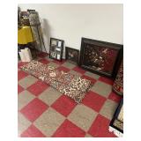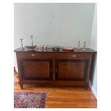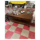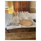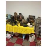Grange dining table with 6 chairs, Grange burled sideboard, mahogany console table, pair of mahogany leather top round side tables, carved sideboard, plaid upholstered arm chair, assorted side tables, lamps, giltwood sun mirror, Maitland Smith gilt mirror, rugs & runners, beautiful bronze chandelier, bedroom furniture, Santini Tango Dancers sculpture, Villeroy & Boch French Garden china and lots of serving pieces, crystal stemware, art glass, pottery, baskets, serving pieces, table linens, decorative accent pieces, art, Christmas, books, hurricane lamps, kitware, marbled espresso set, lots of designer clothes, shoes, bags & accessories, vintage Singers, garage items and lots more! |