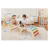Introduce a world of exploration and creativity with the Pikler Triangle Set, designed to captivate toddlers aged 1-6. This colorful wooden climbing toy combines fun and elegance in any indoor play area, promoting both physical and cognitive development. The vibrant rainbow-colored rungs not only engage children visually but also aid in color recognition during play Climbing Toys for Toddlers 1-3 inside includes a climbable arch, a multifunctional ramp, and a climbing triangle, offering toddlers endless opportunities for fun and growth. Additionally, as part of the set, your child will enjoy a comfortable cushion and a vibrant wooden xylophone—perfect for enhancing sensory play and providing extra comfort during rest or quiet activities. Each element is designed to help children safely explore their abilities, enhancing motor skills, balance, and coordination. Inspired by Montessori principles, Toddler Climbing Toys indoor encourages independent play while offering dynamic challenges ensures that each piece is carefully crafted from high-quality materials with smooth, hand-polished surfaces that fit seamlessly into any home. The colorful design brings a cheerful touch to your child’s space, while the thoughtfully constructed playset saves space and is easy to store. Indoor Playground for Kids 1-3 is built to last, ensuring a comfortable and stimulating environment for your child’s development Transform any indoor space into a dynamic play area with the Pikler Triangle Set. Complete with exciting play elements and thoughtful extras, this set offers a perfect balance of fun, development, and long-lasting enjoyment for families looking to create an enriching environment for their children Crafted from Premium Wood: Pikler Triangle Set is made from natural wood with a load capacity of 190 lbs (86 kg). Suitable for kids aged 1-6, it adds warmth and color to any space. The toddler climbing toys indoor with a rainbow design enhances color recognition. Hand-polished finishes make it easy to clean, and maintain. Pikler triangle climbing set is perfect for indoor playset for toddlers 1-3, encouraging creativity and active fun. 8 in 1 Multifunctional Playset:Climbing Toys for Toddlers 1-3 inside offers eight exciting activities: smooth slide, rocking chair, climbing arch, ramp, and tent space for imaginative play. Includes a cushion for comfort and a xylophone to inspire creativity. Climbing wall for toddlers 1-3 inside encourages balance and motor skills. This pikler 8-1 triangle climbing set is ideal for families wanting a baby climbing gym Optimally Sized: Pikler Triangle Set fits comfortably in your home. The Foldable Triangle is 33.46" high, 25.59" wide, and 33.46" long. The Climbing Ramp is 39.37" long and 17.72" wide. The Rounded Arch is 17.72" high, 31.5" long, and 19.69" wide. Climbers for toddlers age 3-5 or 2 year old climbing toys indoor fit any playroom. It's easy to store when not in use